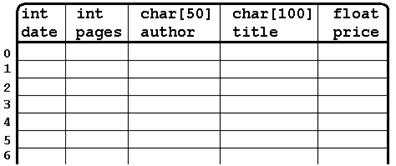 Каждый элемент этого массива это переменная типа book. Т.е. у каждого элемента есть свои поля date, pages, author, title, price. Тут-то и удобно вспомнить о второй интерпретации структуры. В ней массив структур будет выглядеть как таблица.