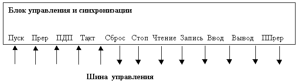 Информация к МП и от него передается по шине данных. Шина данных двунаправленная, 8-ми разрядная. Управляющая шина состоит из 5 линий, ведущих к блоку управления и синхронизации, и 8 выходящих из него линий. По этим линиям передаются управляющие и тактирующие сигналы между компонентами МП и МП и другими блоками ПК.
