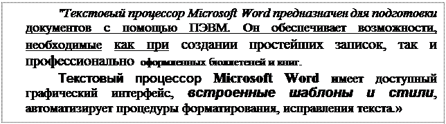 2. Загрузите текстовый процессор Word ( “Пуск” – “Программы” – “Microsoft Word”). Скопируйте Вами набранный текст в окно текстового процессора. Сохраните созданный Вами документ в папке “Мои документы”. Зафиксируйте в конспекте объем памяти, занимаемой документом. Сравните объемы памяти Ваших документов, выполненных в различных редакторах, сделайте выводы.