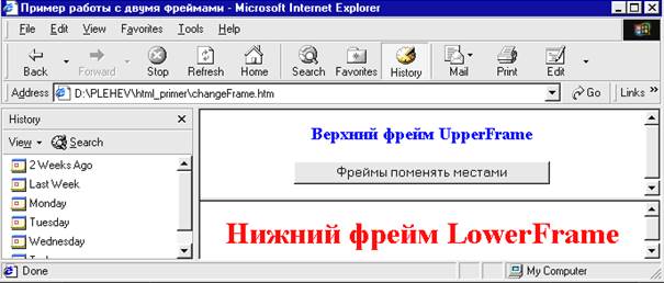 Пример работы с двумя фреймами UpperFrame, LowerFrame (файлы Frame1.htm, Frame2.htm) с кнопкой для их перестановки (рис. 1.6.3.1).