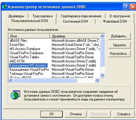 Прежде чем начать работать с базами данных следует создать источник данных ODBC. Командой Пуск//Панель управления/Администрирование/Источники данных ODBC (32) запускается Администратор источников данных (рисунок. 2.1). Используя страницу Пользовательский DSN (источники доступны только текущему пользователю), Системный DSN (источники доступны всем пользователям) или Файловый DSN (файлы), можно установить доступ к конкретному файлу (базе данных, электронной таблице, текстовому файлу): указать DSN‑имя (для ссылки в программах), тип драйвера, пароль, имя пользователя и другую дополнительную информацию. Описания DSN‑источников хранятся в реестре Windows, файловых ‑ в текстовых файлах с расширением DSN. Кнопками Добавить, Удалить и Настройка можно добавлять, удалять и изменять описания источников.