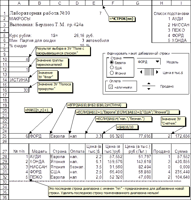 Замечание. В процессе автоматической записи макросов адреса выделяемых клеток записываются либо в обычном виде, либо в виде смещения на указанное количество столбцов и строк. Способ записи зависит от того включен или выключен режим “Относительные ссылки”. Смена режима производится с помощью одноименного инструмента, выполненного в виде переключателя, который находится на панели инструментов “Остановить запись”.
