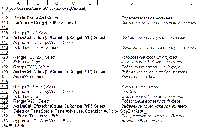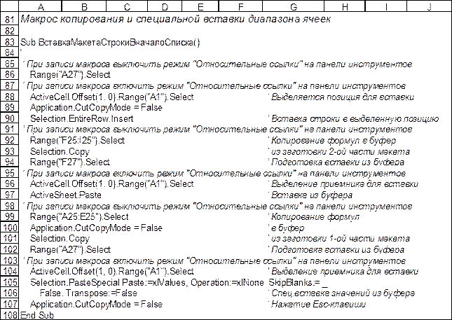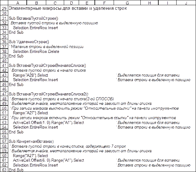 При записи макросов ВставкаПустойСтрокиВначалоСписка2 и КонкретнаяВставка необходимо динамически включать и выключать режим “Относительные ссылки”, руководствуясь указаниями в приводимых ниже комментариях к макросам.