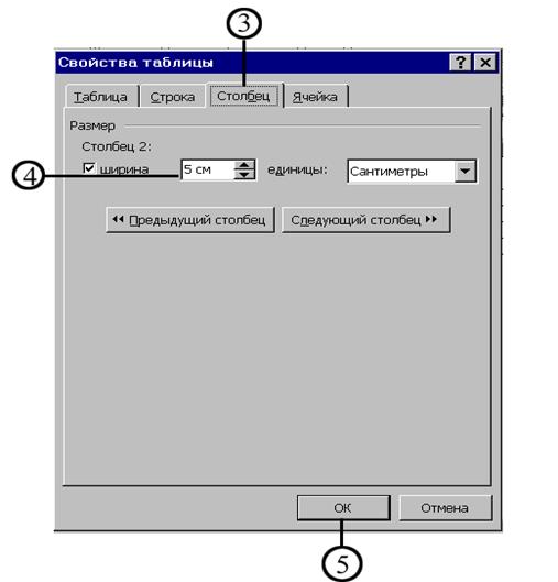Для изменения ширины каждого столбца по отдельности щёлкните кнопку Предыдущий столбец или Следующий столбец на вкладке Столбец диалогового окна Свойства таблицы.