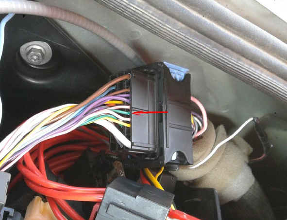 Далее работаем с разъемом, что без синей крышки, что находится ближе к салону автомобиля. Его вместе с косой проводов мы можем поднять, вытащить, так что у нас будет 15-25 см. для удобной врезки своего провода, который мы протянули из салона и спрятали в автомобильную гофру с целью защиты.