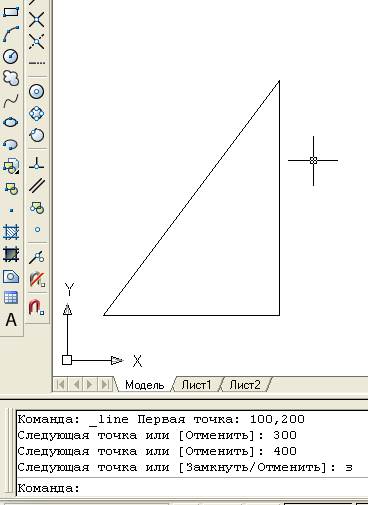 Приклад. Накреслити прямокутний трикутник, катети якого дорівнюють 300 (відкладати по осі X вправо) і 400 (відкладати по осі Y вверх). Почати креслення з точки, координати якої (100,200).