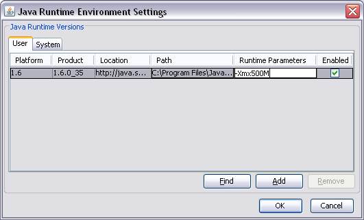 Если у вас не прописаны значения Runtime Parameters, необходимо в зависимости от размера оперативной памяти компьютера прописать одно из следующих значений параметра Java Runtime Parameters: