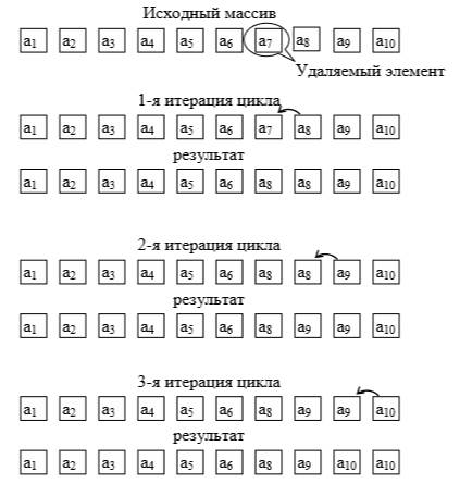 Внутренний цикл сдвига можно проиллюстрировать на примере удаления седьмого элемента из массива, содержащего 10 элементов (рис. 5.2).