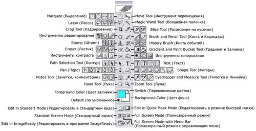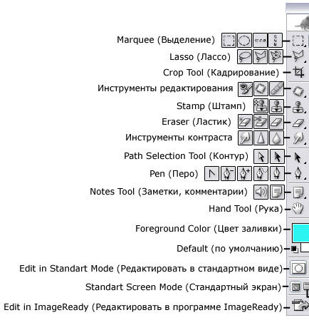 Панель инструментов в Photoshop - это 56 инструментов, палитра цветов и еще 6 вспомогательных кнопок.