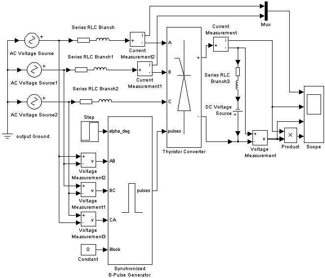 В модели преобразователя использованы как блоки библиотеки SimPowerSystems (источники переменного напряжения, тиристорный мост, система управления, RLC-цепи, измерители тока и напряжения), так и блоки основной библиотеки Simulink (осциллограф, блок ступенчатого сигнала, сумматоры и т.д.). Вычисление мгновенной мощности в нагрузке выполняется путем перемножения сигналов пропорциональных току и напряжению нагрузки, которые формируются с помощью соответствующих измерителей.