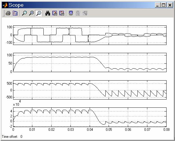При наблюдении переменных блоком Scope следует иметь в виду, что блок показывает мгновенные значения переменных. Иными словами, максимальное значение синусоидальной переменной, показываемое осциллографом, будет в больше, чем заданное в параметрах блока действующее значение.