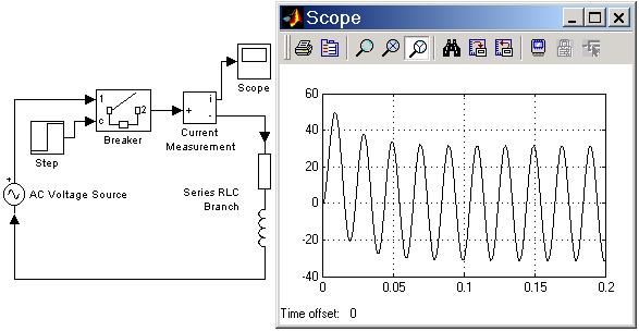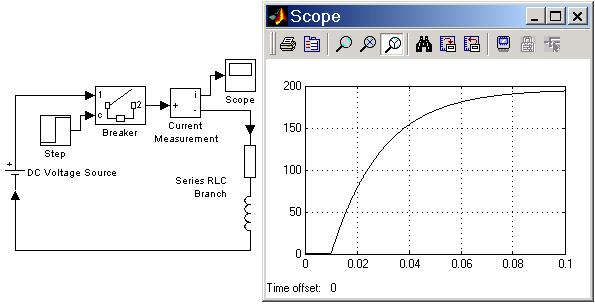 На рис. 1.3 показан пример включения активно-индуктивной нагрузки на постоянное напряжение. Подключение источника к нагрузке обеспечивается блоком Breaker, который замыкает электрическую цепь по сигналу вырабатываемому генератором ступенчатого сигнала Step. Измерение тока в цепи выполняется с помощью блока Current Measurement. Полученный измерителем сигнал отображается с помощью блока Scope.