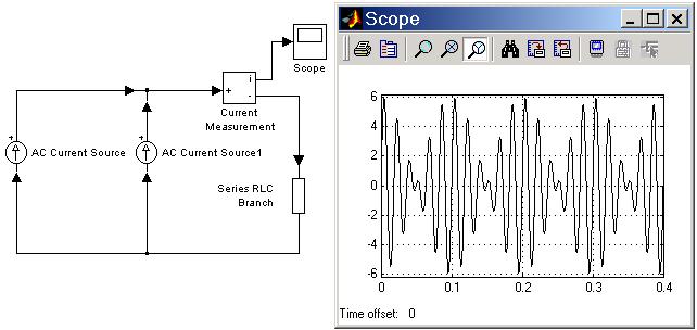 На рис. 1.5 показана схема, моделирующая работу двух источников тока на активную нагрузку. Источники имеют одинаковую амплитуду тока (3 А), но разную частоту (50 и 60 Гц). Ток в нагрузке является суммой токов этих двух источников.