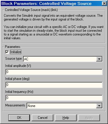 [Начальная фаза (град)]. Начальная фаза. Параметр доступен, источник инициализируется как источник переменного напряжения.