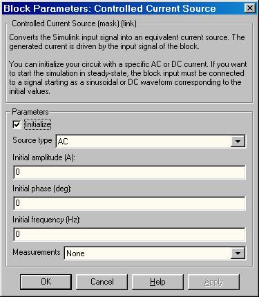 [Начальная фаза (град)]. Начальная фаза. Параметр доступен, источник инициализируется как источник переменного тока.