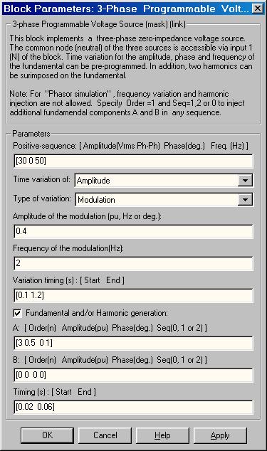 [A: [Гармоника (n) Амплитуда Фаза (град) Последовательность (0, 1 или 2)]]. В графе задается вектор параметров генерируемой гармоники напряжения: номер гармоники, амплитуда (в относительных единицах), начальная фаза, последовательность (0 - нулевая, 1 - прямая, 2 - обратная). Результирующее выходное напряжение будет являться суммой напряжений заданных в графе Positive-sequence и в данной графе.
