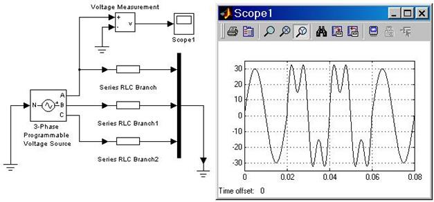 На рис. 1.8 показана схема с использованием трехфазного программируемого источника напряжения, подключенного к симметричной активной нагрузке. В интервале времени от 0.02 до 0.06 с источник дополнительно генерирует третью гармонику напряжения прямой последовательности с амплитудой 0.5 о.е.
