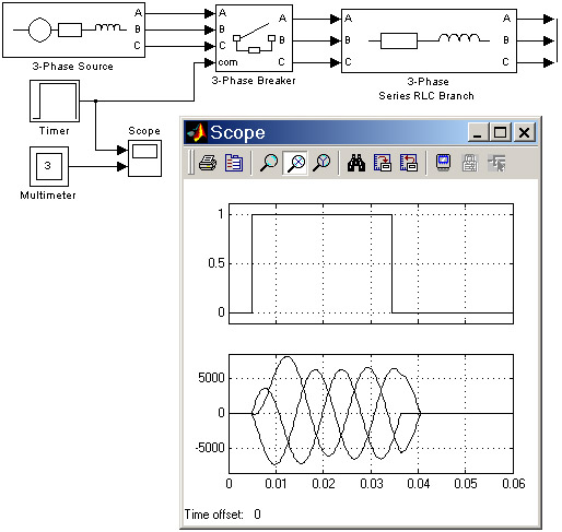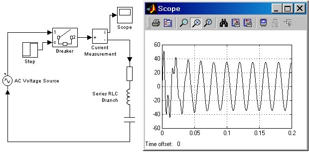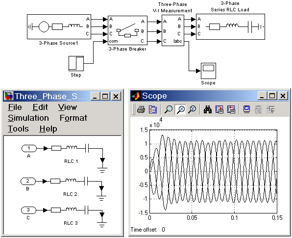 На рис. 1.23 показана схема, в которой трехфазная последовательная RLC-цепь подключается к трехфазному источнику напряжения с действующим значением линейного напряжения 25 кВ и частотой 50 Гц. Подключение осуществляется с помощью блока 3-Phase Breaker. Параметры цепи выбраны следующими: R = 0.1 Ом, L = 0.1*10-3 Гн и C = 0.05*10-3 Ф. Для измерения тока в трехфазной системе использован блок Three-Phase V-I Measurement. На рисунке показана также схема блока 3-Phase Series RLC Branch.