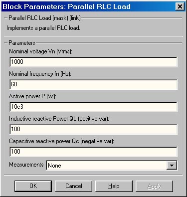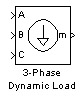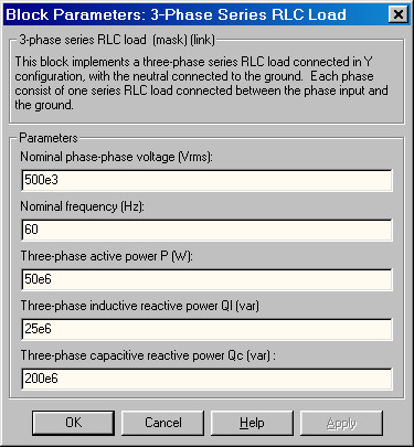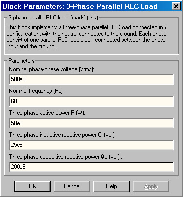 Моделирует трехфазную цепь, состоящую из трех параллельных RLC-нагрузок. Схема соединения цепей - звезда с заземленной нейтралью. Параметры цепи задаются через мощности фаз цепи при номинальном напряжении и частоте.