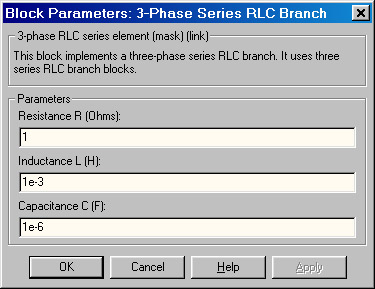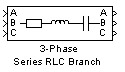 Моделирует трехфазную цепь, состоящую из трех RLC-цепей.