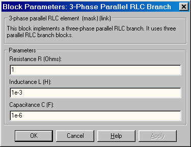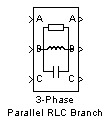 Моделирует трехфазную цепь, состоящую из трех параллельных RLC-цепей. На рисунке показана также схема блока 3-Phase Parallel RLC Branch.
