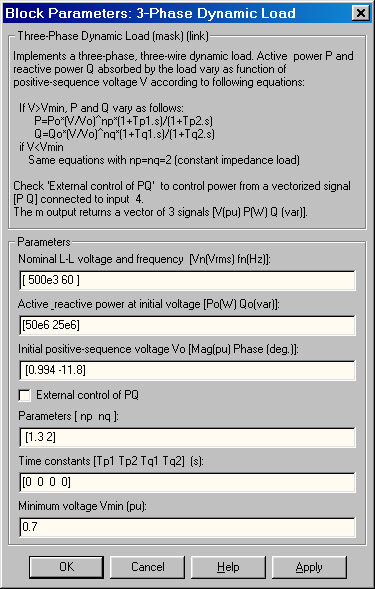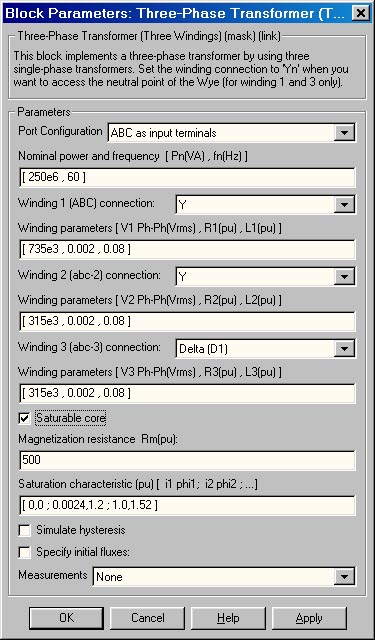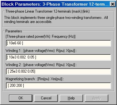 Magnetizing branch: [Rm(pu) Lm(pu)]: [Параметры цепи намагничивания]. Активное сопротивление (о.е.) и индуктивность (о.е.) цепи намагничивания. Параметр доступен, если флажок Saturable core не установлен (моделируется линейный трансформатор).