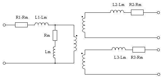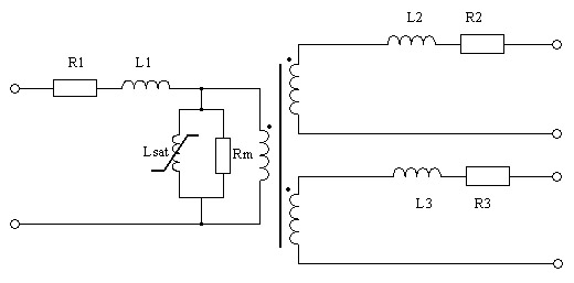 Моделирует трех или двух обмоточный однофазный трансформатор. В модели учитывается нелинейность характеристики намагничивания материала сердечника. Схема замещения трансформатора показана на рис. 1.143.