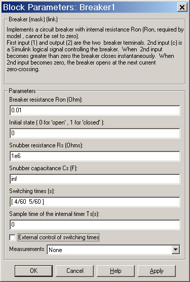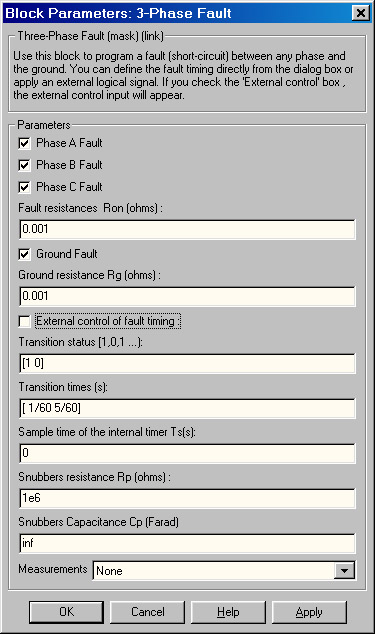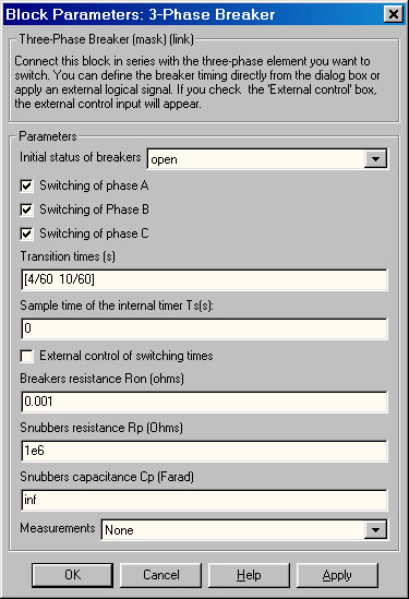 [Сопротивление (Ом)]. Величина активного сопротивления в одной фазе. Для исключения резистора из цепи значение сопротивления нужно задать равным inf (бесконечность). В этом случае на пиктограмме блока резистор отображаться не будет.