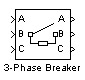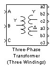 Моделирует трехобмоточный трехфазный трансформатор. Модель построена на основе трех однофазных трансформаторов. В модели может учитываться нелинейность характеристики намагничивания материала сердечника.
