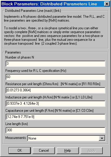 Для моделирования двух-, трех- или шестифазной симметричной линии можно задать параметры линии в виде матриц размерностью NxN (N - число фаз) или задать параметры прямой последовательности. Для двух- или трехфазной транспонированной линии можно ввести параметры прямой и нулевой последовательности. Для шестифазной транспонированной линии нужно дополнительно задать параметры нулевой последовательности взаимного сопротивления, индуктивности и емкости. Для моделирования несимметричной линии требуется задать матрицы параметров размерностью NxN.