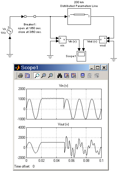 На рис. 1.39 показана схема, моделирующая процессы подключения к источнику линии электропередачи длиной 100 км.