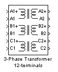 Моделирует трехфазный линейный трансформатор. Модель построена на основе трех однофазных линейных трансформаторов. Блок имеет отдельные зажимы для всех выводов обмоток трансформатора.