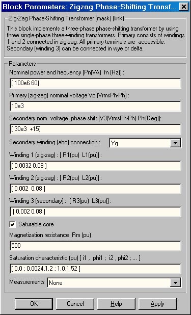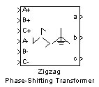Моделирует трехфазный трансформатор, первичные обмотки которого соединены в зигзаг. Модель построена на основе трех однофазных трехобмоточных трансформаторов. Все зажимы первичных обмоток доступны. В модели может учитываться нелинейность характеристики намагничивания материала сердечника.