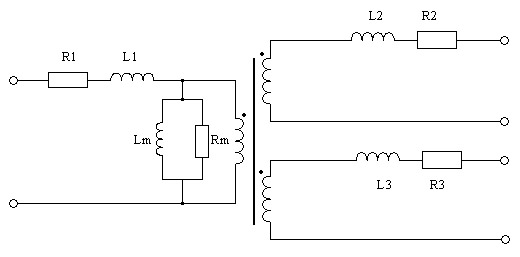 Моделирует трех или двух обмоточный однофазный трансформатор. Нелинейность характеристики намагничивания материала сердечника не учитывается. Схема замещения трансформатора показана на рис. 1.141.