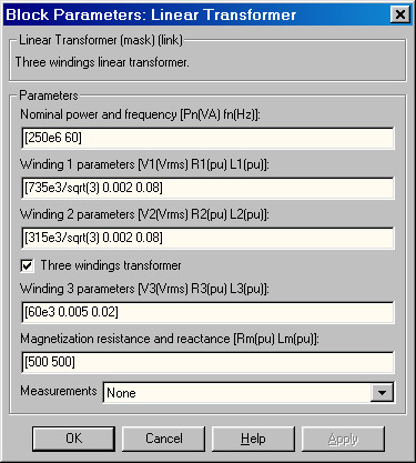 Winding 3 (secondary): [ R3(pu) L3(pu)]: [Параметры третьей обмотки]. Активное сопротивление (о.е.) и индуктивность (о.е.) третьей (вторичной) обмотки однофазного трехобмоточного трансформатора.