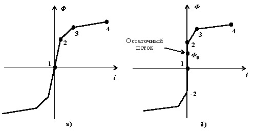 Нелинейная характеристика в модели задается как кусочно-линейная зависимость между магнитным потоком сердечника и током намагничивания (рис. 1.44 а). В модели имеется возможность задать остаточный магнитный поток в сердечнике. В этом случае вторая точка нелинейной характеристики должна соответствовать нулевому току (рис. 1.44 б).