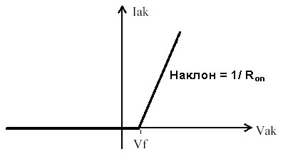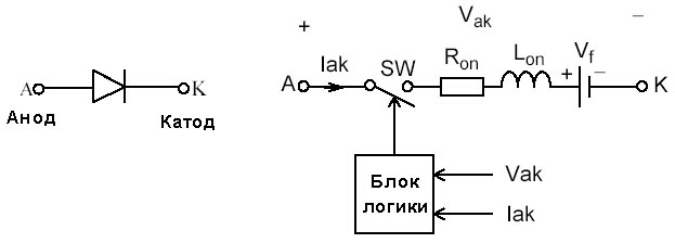 Модель диода состоит из последовательно включенных резистора Ron, индуктивности Lon, источника постоянного напряжения Vf и ключа SW (рис. 1.46). Блок логики управляет работой ключа. При положительном напряжении на диоде (Vak - Vf) происходит замыкание ключа и через прибор начинает протекать ток. Размыкание ключа (выключение диода) выполняется при снижении тока Iak, протекающего через диод, до нуля.