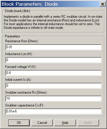 [Начальное значение тока (А)]. При значении параметра равном нулю моделирование начинается при закрытом состоянии диода. Если параметр задан положительным значением, то моделирование будет начато при открытом состоянии диода.