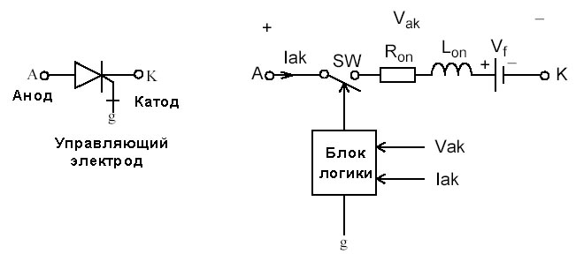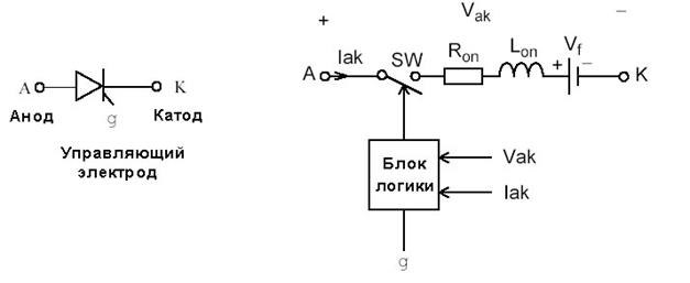 Упрощенная модель тиристора состоит из последовательно включенных резистора Ron, индуктивности Lon, источника постоянного напряжения Vf и ключа SW (рис. 1.49). Блок логики управляет работой ключа. При положительном напряжении на тиристоре (Vak - Vf) и наличии положительного сигнала на управляющем электроде (g) происходит замыкание ключа и через прибор начинает протекать ток. Размыкание ключа (выключение тиристора ) выполняется при снижении тока Iak, протекающего через тиристор, до нуля.