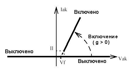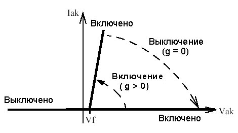 Статические вольт-амперные характеристики модели полностью управляемого тиристора для включенного и выключенного состояний показаны на рис. 1.52.