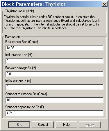 На выходном порту блока, обозначенном m, формируется векторный Simulink-сигнал из двух элементов. Первый элемент - анодный ток тиристора, второй - напряжение анод-катод тиристора.