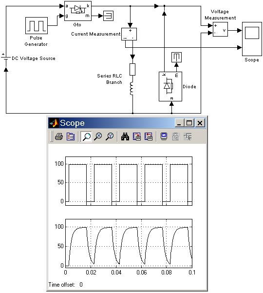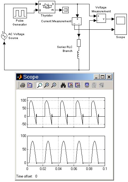 На рис. 1.50 показана схема модели, управляемого однополупериодного выпрямителя, работающего на активно-индуктивную нагрузку. Импульсы управления тиристором формируются блоком Pulse Generator, при этом величина угла управления тиристором определяется длительностью фазовой задержки (Phase Delay) генератора.