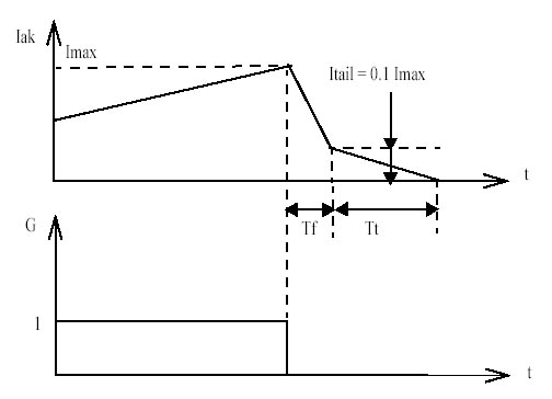 В модели учитывается также конечное время выключения тиристора. Процесс выключения разбит на два участка (рис. 1.53) и характеризуется, соответственно, временем спада (Tf), при котором анодный ток уменьшается до 0.1 от тока в момент выключения (Imax) и временем затягивания (Tt), при котором анодный ток уменьшается до нуля.