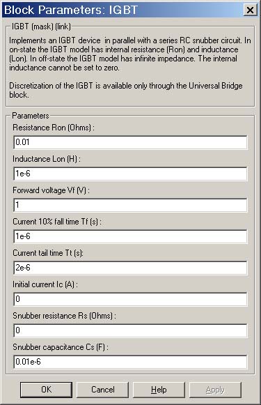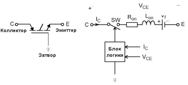 Модель IGBT транзистора состоит из последовательно включенных резистора Ron, индуктивности Lon, источника постоянного напряжения Vf и ключа SW (рис. 1.55). Блок логики управляет работой ключа. Включение прибора происходит в случае, если напряжение коллектор-эмиттер положительно и больше, чем Vf и на затвор транзистора подан положительный сигнал (g > 0). Выключение прибора происходит при уменьшении сигнала на затворе до нуля (g = 0). При отрицательном напряжении коллектор-эмиттер транзистор находится в выключенном состоянии.