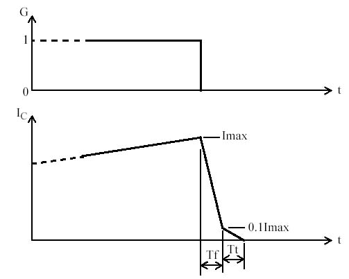 В модели учитывается также конечное время выключения транзистора. Процесс выключения разбит на два участка (рис. 1.57) и характеризуется, соответственно, временем спада (Tf), при котором ток коллектор-эмиттер уменьшается до 0.1 от тока в момент выключения (Imax) и временем затягивания (Tt), при котором ток уменьшается до нуля.