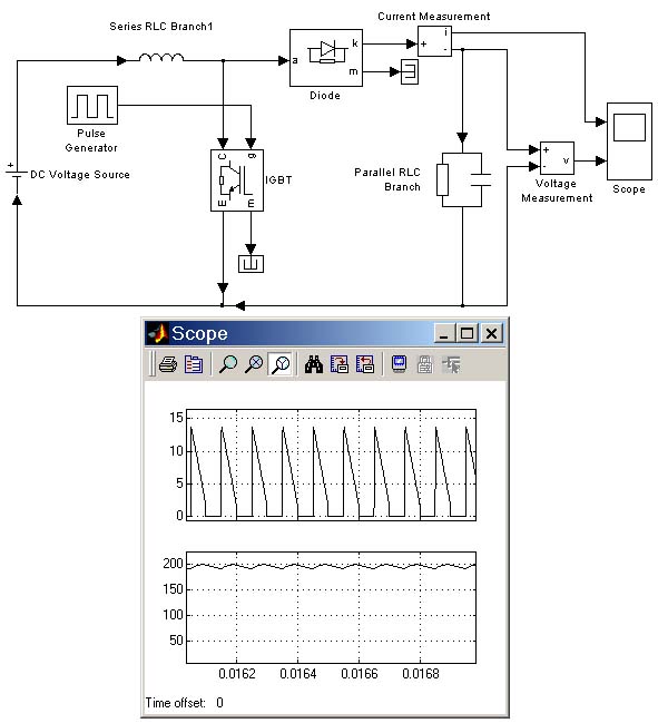 На рис. 1.58 показана схема модели нереверсивного широтно-импульсного преобразователя постоянного напряжения с параллельным включением транзистора по отношению к нагрузке. На рисунке представлены также графики напряжения и тока в активно-емкостной нагрузке.
