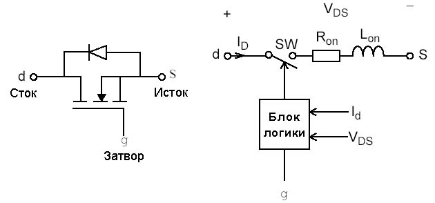 Модель Mosfet транзистора состоит из последовательно включенных резистора Ron, индуктивности Lon и ключа SW (рис. 1.59). Блок логики управляет работой ключа. Включение прибора происходит в случае, если напряжение сток-исток положительно и на затвор транзистора подан положительный сигнал (g > 0). Выключение прибора происходит при уменьшении сигнала на затворе до нуля (g = 0). При отрицательном напряжении коллектор-эмиттер транзистор находится в выключенном состоянии и ток проводит обратный диод.