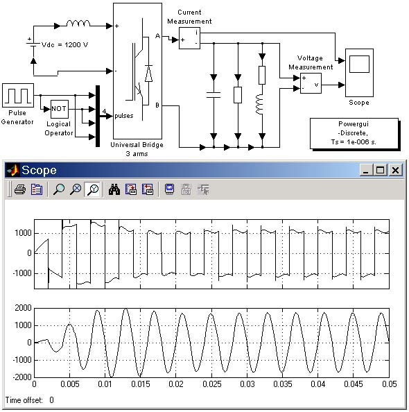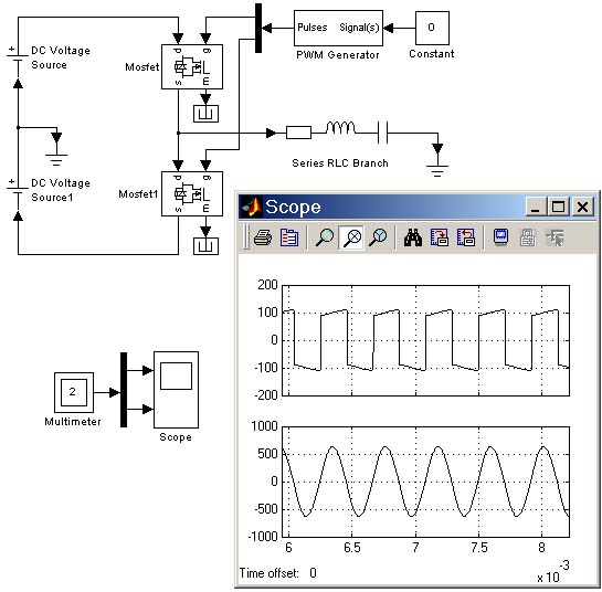 На рис. 1.61 показана схема модели полумостового однофазного инвертора, работающего на резонансную нагрузку. На рисунке представлены также графики напряжения и тока в нагрузке.