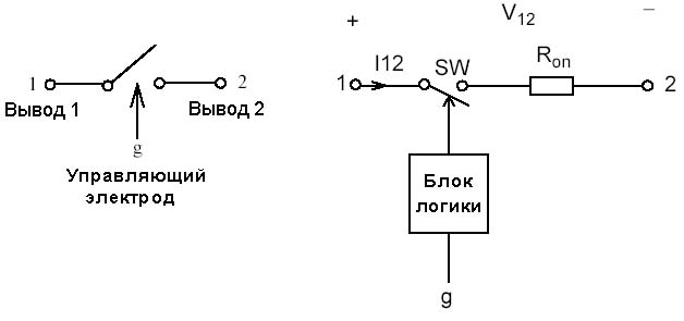 Модель ключа состоит из последовательно соединенных резистора Ron и ключа SW (рис. 1.62). Блок логики управляет работой ключа. Включение прибора происходит в случае, если на управляющий вход подан единичный положительный сигнал (g 1). Выключение прибора происходит при уменьшении сигнала на затворе до нуля (g = 0).