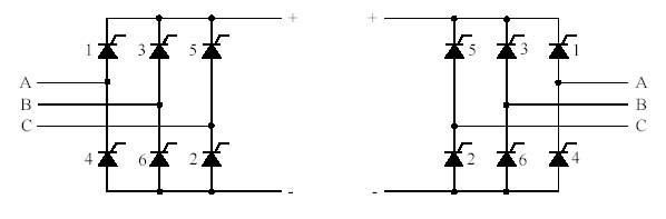 Модель позволяет выбирать количество плеч моста (от 1 до 3), вид полупроводниковых приборов (диоды, тиристоры, идеальные ключи, а также полностью управляемые тиристоры, IGBT и MOSFET транзисторы, шунтированные обратными диодами). В модели можно также выбрать вид зажимов A, B и C (входные или выходные). На рис. 165, в качестве примера, представлены схемы тиристорного трехфазного моста для обоих вариантов вида входных зажимов.